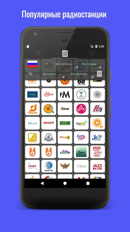 - Большой выбор радиостанций и тематик