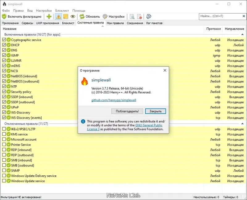 Simplewall — это бесплатный и открытый фаервол, созданный для обеспечения высокой степени защиты компьютера без необходимости сложных настроек. Он использует возможности Windows Filtering Platform (WFP) для фильтрации сетевого трафика и обладает широкими возможностями по созданию правил блокировки и разрешения. Программа поддерживает работу в двух режимах: фильтрацию по белому или черному списку, что позволяет гибко управлять сетевой активностью приложений и служб.