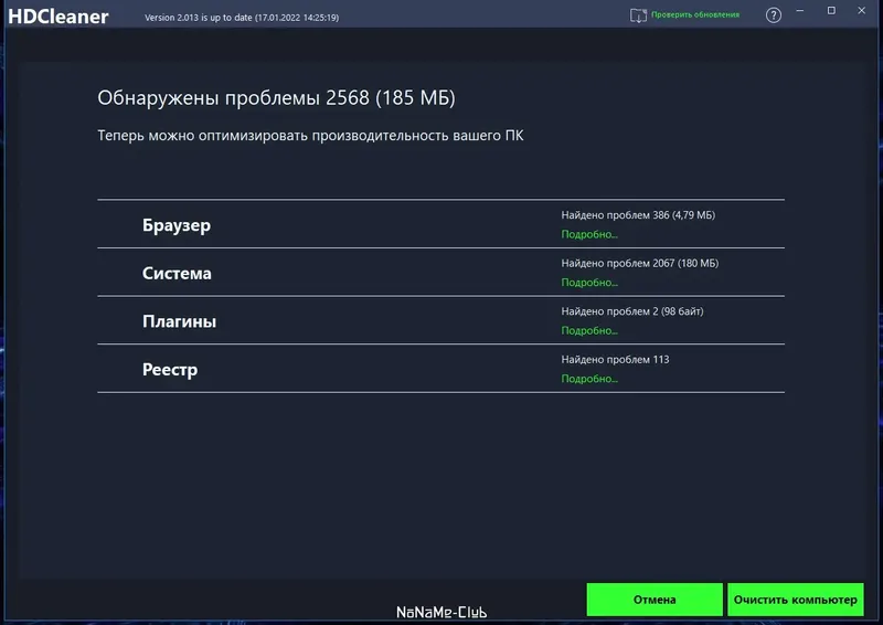 - Анализирует автозагрузку, системный реестр и папки с временными файлами, обеспечивая высокий уровень безопасности.