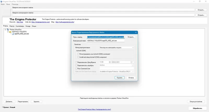 Для использования Enigma Virtual Box необходимо запустить программу и выбрать исходный файл приложения, который вы хотите объединить. После этого в интерфейсе можно добавить необходимые файлы, настроить параметры сжатия и виртуализации. В дальнейшем достаточно указать место для сохранения готового файла, и программа выполнит все автоматические процессы. Интуитивный интерфейс и пошаговые инструкции позволяют легко понять, как пользоваться этим инструментом даже новичкам. В результате создается единый исполняемый файл, полностью готовый к использованию без дополнительных настроек или установок.
