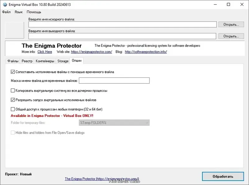 Enigma Virtual Box — это бесплатная утилита для виртуализации приложений, которая позволяет объединить все компоненты программы в один файл без создания временных или виртуальных файлов на диске. Эта система идеально подходит для создания портативных решений, обеспечивая удобство использования и минимальный размер конечного продукта. Программа поддерживает широкий спектр файловых типов и позволяет сжать виртуальные файлы, значительно уменьшая общий размер приложения.