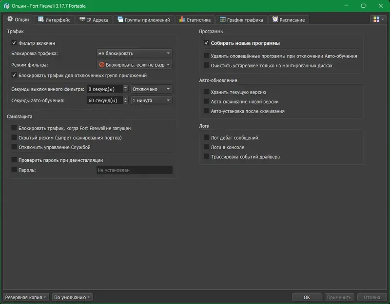 - Настройка правил фильтрации по IP-адресам и группам приложений