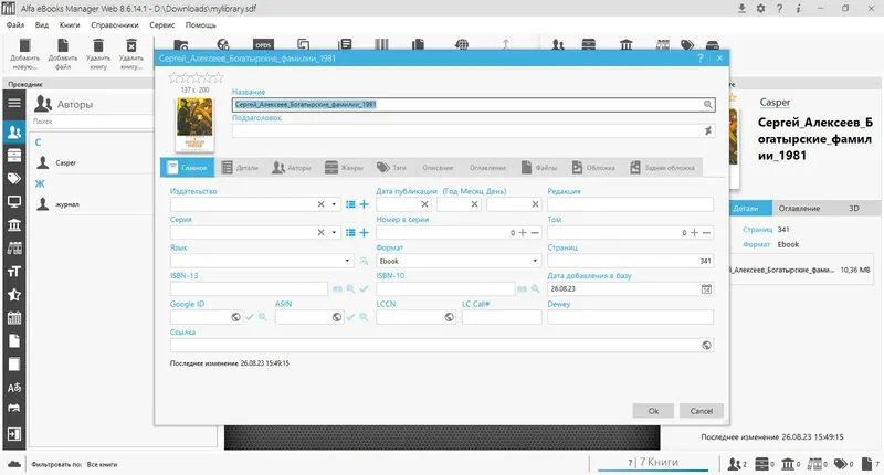 Alfa eBooks Manager — это одна из самых популярных читалок и менеджеров для книг различных форматов, объединяющая функции библиотеки и инструмента для организации коллекции. Программа позволяет создавать и редактировать карточки книг, добавлять метаданные, обложки и теги, а также интегрировать данные с популярных сайтов, таких как Литрес или Books.ru. Благодаря встроенному конвертеру и поддержке множества форматов, она подходит для хранения PDF, EPUB, MOBI, FB2, а также аудиокниг в форматах MP3 и M4B. Возможность прослушивания аудиокниг и чтения с помощью встроенного Alfa Reader делает программу универсальной для различных сценариев использования.