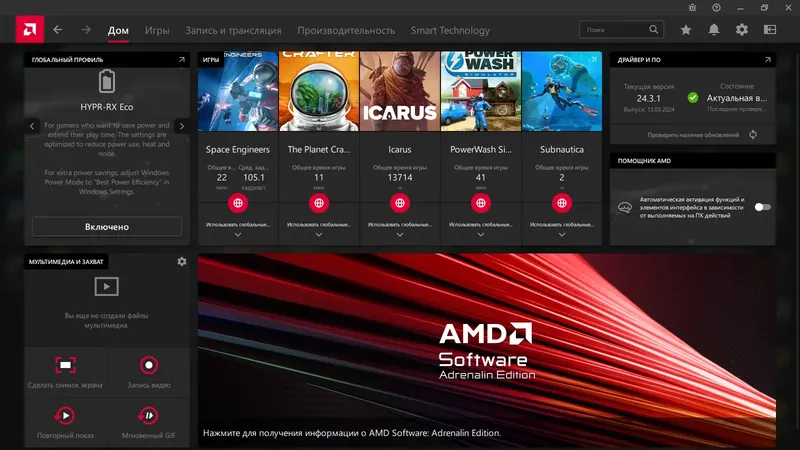 AMD Radeon Software Adrenalin Edition — это современное приложение для настройки и оптимизации графических карт AMD Radeon. Оно предоставляет пользователям широкий набор функций для повышения производительности игр, улучшения изображения и удобства использования. Благодаря интуитивно понятному интерфейсу, даже начинающие пользователи смогут легко настроить систему под свои потребности и получить максимум от видеокарты.