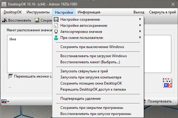 DesktopOK — это бесплатная портативная программа, предназначенная для сохранения и восстановления расположения иконок на рабочем столе Windows. Она позволяет легко управлять макетом значков при изменении разрешения экрана, переключении между мониторами и другими настройками. Утилита не требует установки, занимает мало места и подходит для пользователей, ценящих комфорт и порядок на рабочем столе.