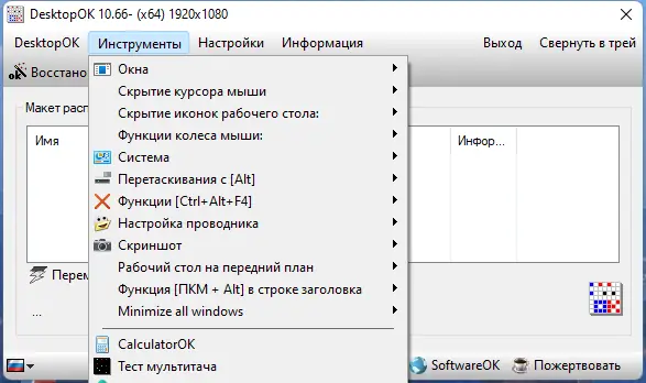 DesktopOK — это легкая и удобная программа для сохранения и восстановления расположения иконок на рабочем столе Windows. Она предназначена для пользователей, которым важно поддерживать порядок и быстро восстанавливать привычный вид рабочего стола при изменении разрешения или подключении внешних устройств. Программа не требует установки, что обеспечивает быстрый запуск и портативность, а также обладает разнообразными функциями для оптимизации рабочего пространства.