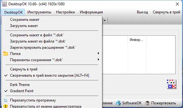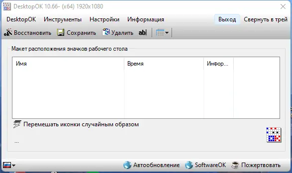 Для использования DesktopOK достаточно скачать программу с официального сайта и запустить ее без установки. После запуска программа автоматически создаст конфигурационный файл, в котором сохранятся текущие настройки расположения иконок. Для сохранения текущего макета необходимо нажать соответствующую кнопку, а для восстановления — выбрать сохраненную конфигурацию из списка. Также можно настроить автоматическое сохранение настроек при изменениях или при выключении системы. В настройках доступны функции смены языка интерфейса и быстрого доступа к сохраненным макетам через системный лоток.