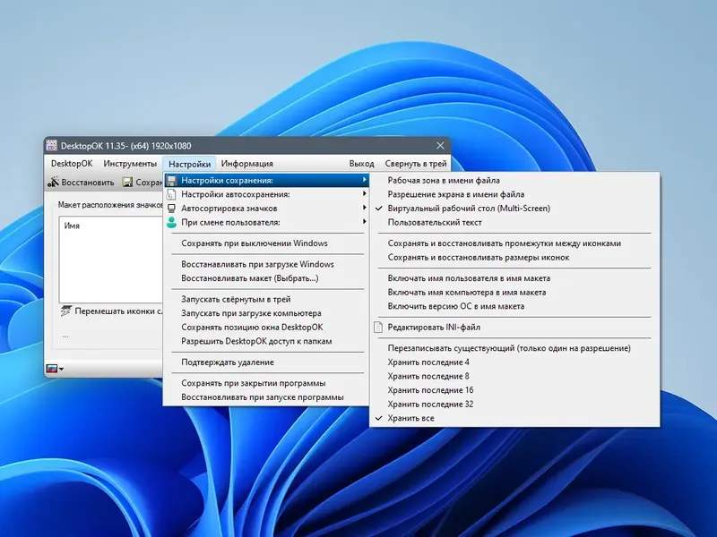 Для использования DesktopOK достаточно запустить программу, после чего она автоматически предложит сохранить текущий макет значков или выбрать уже сохраненный. В настройках можно задать автоматическое сохранение макета при изменениях, а также настроить горячие клавиши для быстрого восстановления порядка. В меню доступны инструменты для изменения размера значков, скрытия или отображения элементов рабочего стола, а также сворачивания всех окон. При необходимости можно создать профили для разных разрешений и быстро переключаться между ними. Для портативной версии достаточно скопировать файлы программы и настроить файл ini, чтобы использовать DesktopOK без установки. Интуитивно понятный интерфейс и наличие многоязычной поддержки делают программу доступной для широкого круга пользователей.