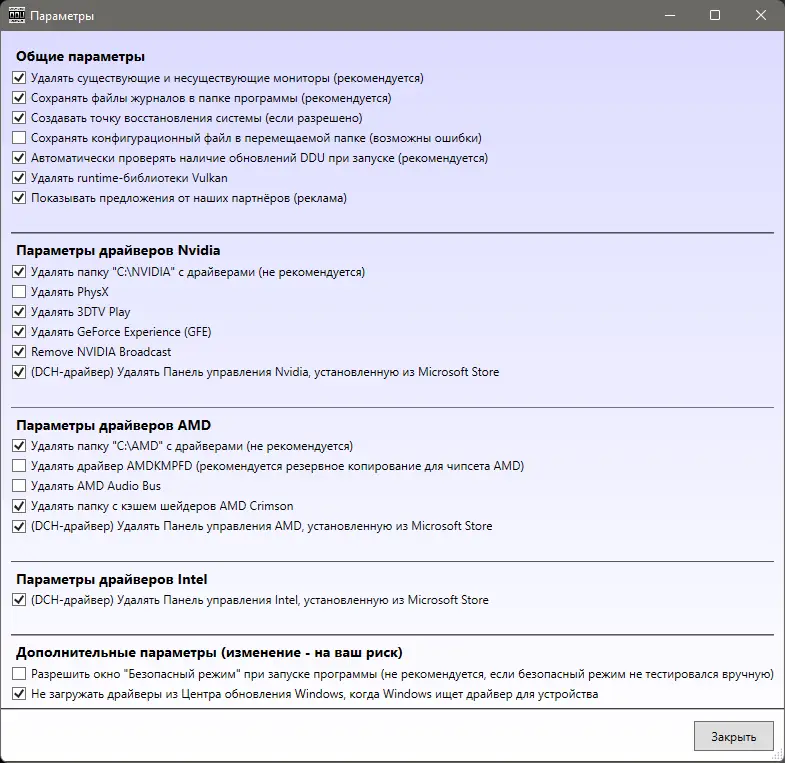 - Полное удаление драйверов видеокарт AMD, NVIDIA и Intel без остатка