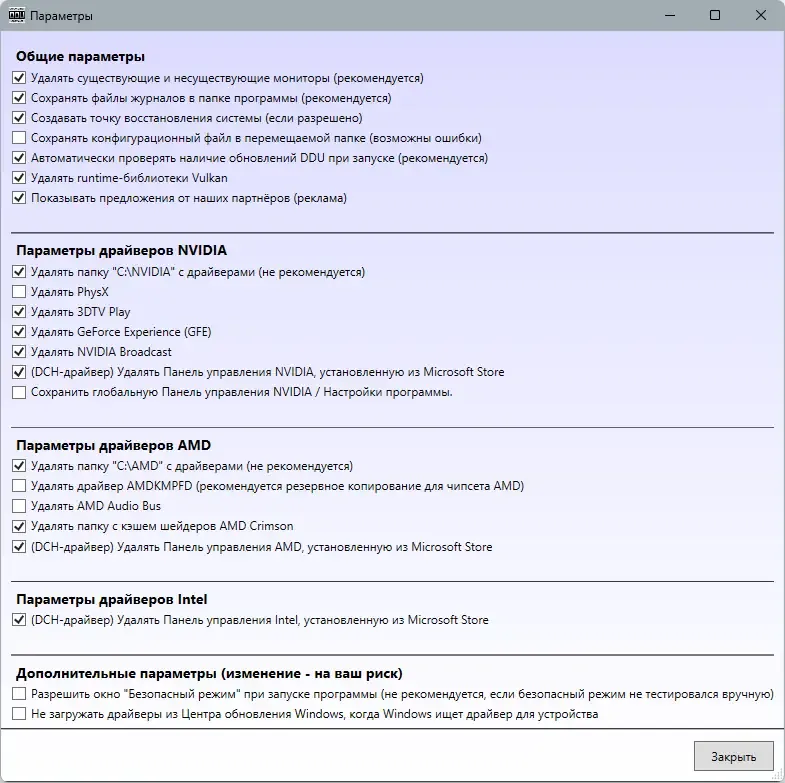 - Полное удаление драйверов видеокарт AMD, NVIDIA, Intel и звуковых карт Realtek, Sound Blaster