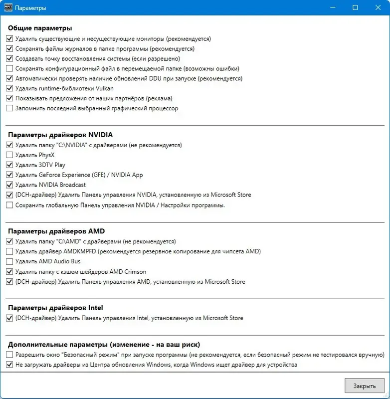 - Полное удаление драйверов видеокарт AMD, NVIDIA, Intel и звуковых карт Realtek, Sound Blaster.