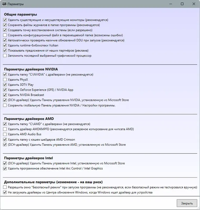 - Полное удаление драйверов видеокарт и звуковых устройств