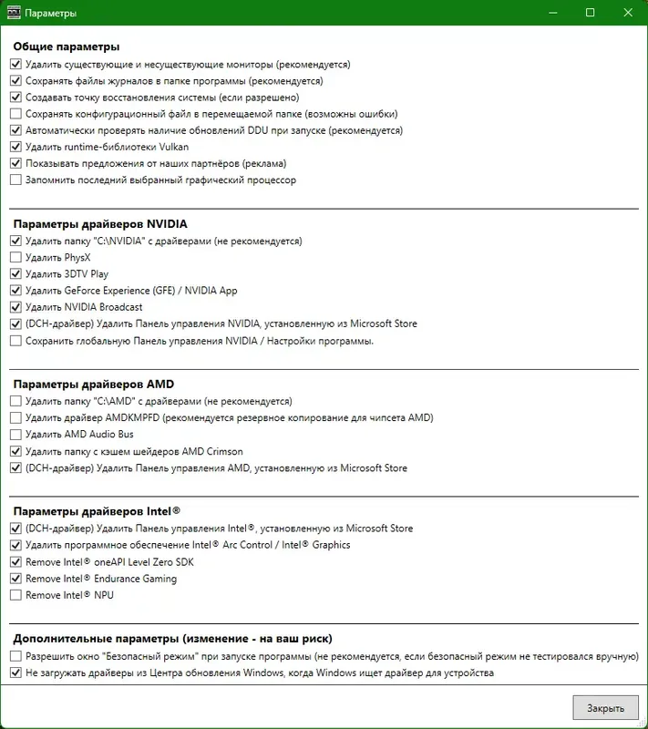 - Полное удаление драйверов видеокарт AMD, NVIDIA и Intel.