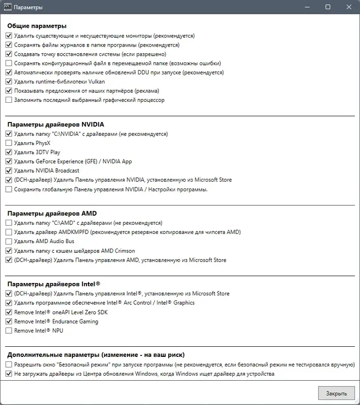- Полное удаление драйверов видеокарт и звуковых устройств.