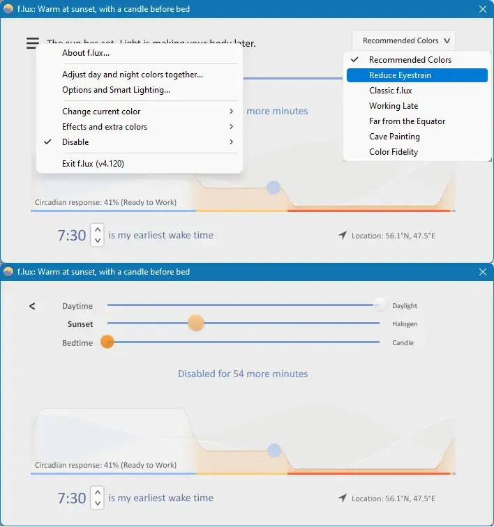f.lux — это универсальный инструмент, предназначенный для автоматической настройки цветопередачи экрана в соответствии с текущим временем суток. Он помогает снизить усталость глаз, уменьшить воздействие яркого света и улучшить общее самочувствие во время работы за ПК. Благодаря возможностям точной настройки и автоматического определения местоположения, программа обеспечивает комфортные условия для длительной работы или отдыха за компьютером, а также помогает регулировать освещение в помещении.