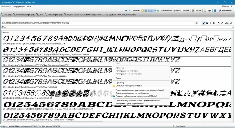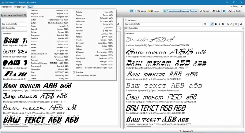 FontViewOK — это компактная и универсальная программа, предназначенная для быстрого отображения всех установленных шрифтов на компьютере. Она позволяет не только просматривать шрифты в различных стилях, но и вводить произвольный текст для мгновенного предварительного просмотра. Функциональность включает изменение цвета, размера и стиля шрифта, что делает работу с ними максимально удобной и эффективной. Программа обладает портативной версией, которая не требует установки и легко запускается с любого носителя, что обеспечивает мобильность и простоту использования.