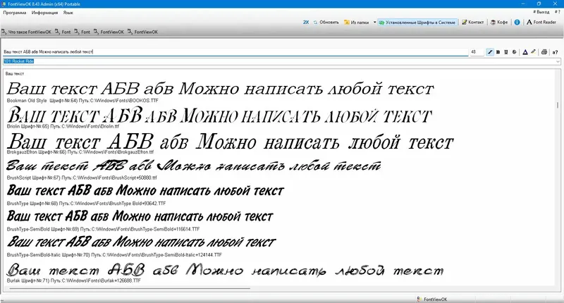 FontViewOK — небольшая программа, которая позволяет быстро просматривать все установленные шрифты в системе и экспериментировать с ними. Она дает возможность вводить любой текст и сразу видеть, как он будет выглядеть в выбранном стиле. Это удобное решение для дизайнеров, типографов и разработчиков, которым важно подобрать оптимальный шрифт для своего проекта.