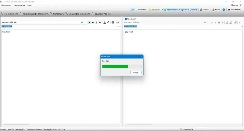После запуска программы пользователь видит интерфейс с двумя панелями предварительного просмотра. В верхней части есть поле для ввода текста, где можно набрать любой фрагмент. Ниже расположены настройки для изменения цвета, размера, стиля и прочих параметров шрифта. В любой из панелей можно выбрать любой установленный шрифт из списка, чтобы увидеть, как он выглядит в выбранных настройках. Для сравнения двух вариантов достаточно использовать обе панели одновременно. Все изменения отображаются мгновенно, что позволяет быстро оценить визуальный эффект и сделать выбор.