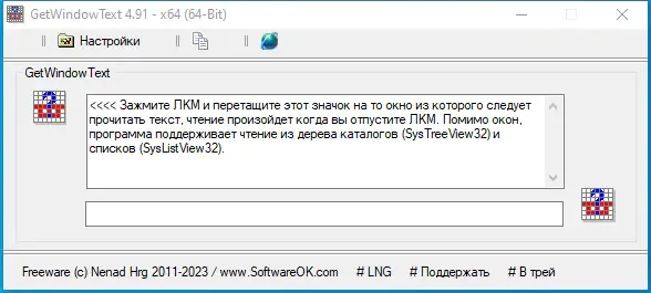 Для использования программы необходимо запустить ее и перетащить значок GetWindowText из окна программы на нужный элемент другого окна, из которого требуется прочитать текст. После этого в основном окне отобразится результат, который можно скопировать и использовать в дальнейшем. Такой подход позволяет легко получать информацию из сложных интерфейсов без необходимости ручного набора или использования дополнительных утилит. Программа совместима с различными версиями Windows и не требует инсталляции, что делает ее максимально удобной для быстрого применения.