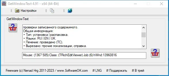 GetWindowText — это удобное решение для быстрого получения текста из интерфейсов Windows. Вы можете скачать его прямо на странице и начать использовать без долгой установки. Благодаря своей портативности и простоте, программа отлично подходит для профессионалов и пользователей, которым необходим быстрый доступ к скрытой или недоступной информации в окнах программ и системных элементов.