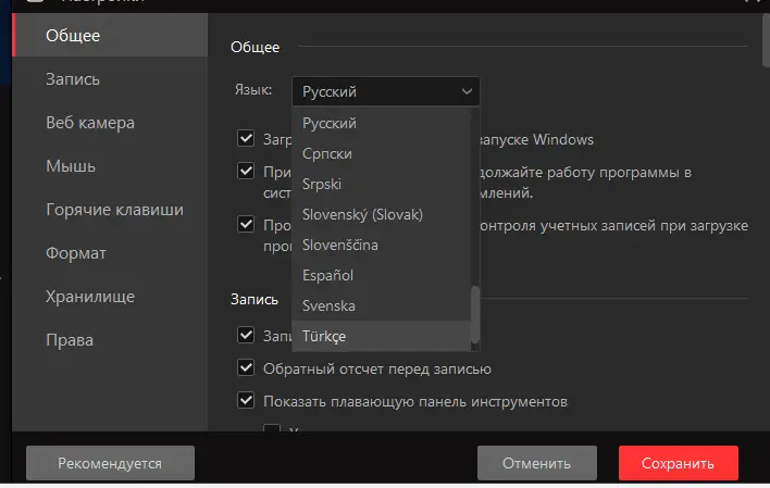 - Запись видео с экрана в высоком качестве и с возможностью выбора области