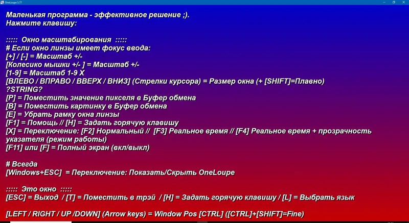 OneLoupe представляет собой простую, но функциональную экранную лупу, которая не требует установки и может запускаться с любого носителя. Основное преимущество — возможность регулировки масштаба с помощью специального регулятора, что позволяет адаптировать увеличение под конкретные задачи. В дополнение к базовым функциям, программа оснащена инструментом пипетки для точного определения цветов и поддержкой работы с буфером обмена, что значительно облегчает работу с изображениями и текстом. Благодаря поддержке управления через клавиатуру, пользователь может быстро и удобно настраивать параметры без использования мыши.