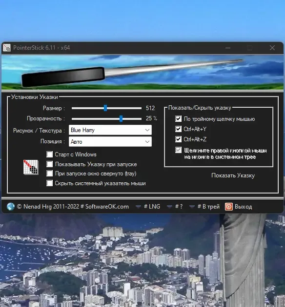 - Легкая настройка размера и прозрачности указки для комфортного использования.