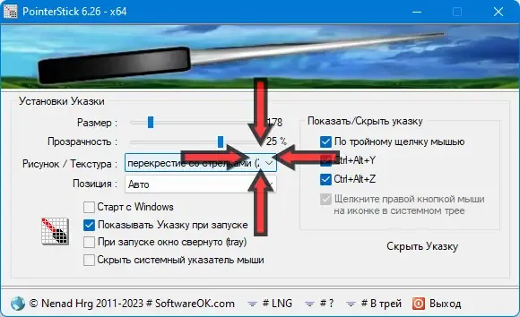 Для использования программы достаточно запустить файл PointerStick.exe. После этого курсор мыши автоматически превратится в крупную указку, которая будет легко управляться. В настройках можно изменить размер, прозрачность и текстуру указки, чтобы она максимально соответствовала вашим предпочтениям. Для быстрого скрытия или активации указки можно использовать заданные горячие клавиши, что особенно удобно во время презентаций. Все параметры сохраняются в файле .ini, что позволяет легко переносить программу и настраивать ее под свои нужды.