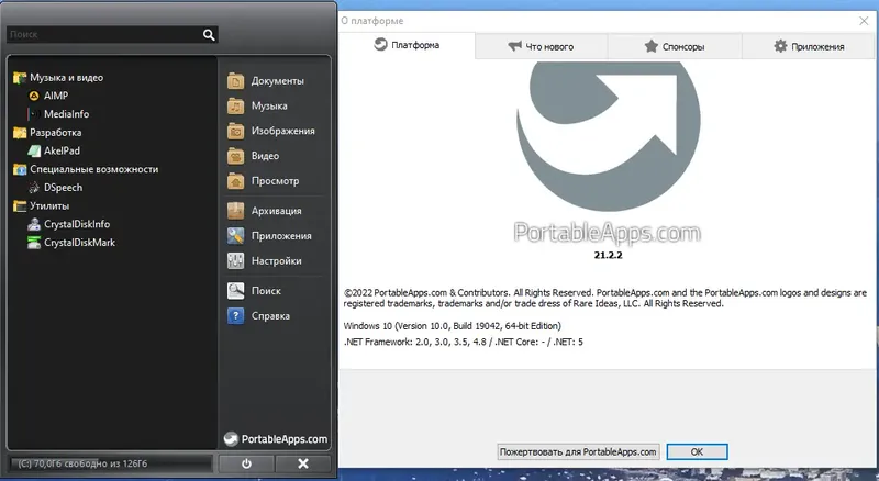 - Поддержка большого числа портативных приложений и утилит.