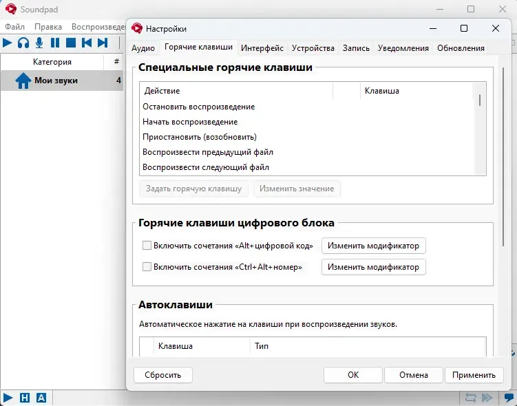 - Поддержка горячих клавиш и группировки звуков
