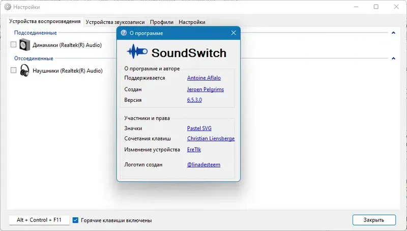 SoundSwitch — это компактное решение для быстрой смены аудиоустройств в операционных системах Windows 10 и Windows 11. Она позволяет пользователям легко управлять несколькими устройствами воспроизведения и записи звука, избавляя от необходимости вручную искать нужные параметры в системных настройках. Программа поддерживает множество языков, включая русский, и предоставляет широкие возможности по настройке уведомлений и горячих клавиш. Это делает ее незаменимым инструментом для профессиональных музыкантов, подкастеров и обычных пользователей, которым важно быстро переключать аудиоустройства.
