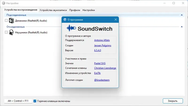 SoundSwitch — это удобная бесплатная утилита для быстрого переключения между различными звуковыми устройствами на компьютере. Она особенно полезна, если у пользователя подключено несколько источников звука, таких как домашняя аудиосистема, студийные мониторы, наушники с микрофоном или гарнитурой для записи. Благодаря простому управлению через горячие клавиши, программа значительно облегчает работу с аудиоустройствами, избавляя от необходимости постоянного поиска нужных элементов в меню настроек системы.