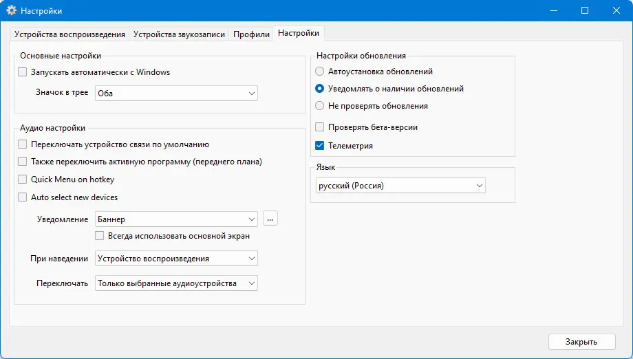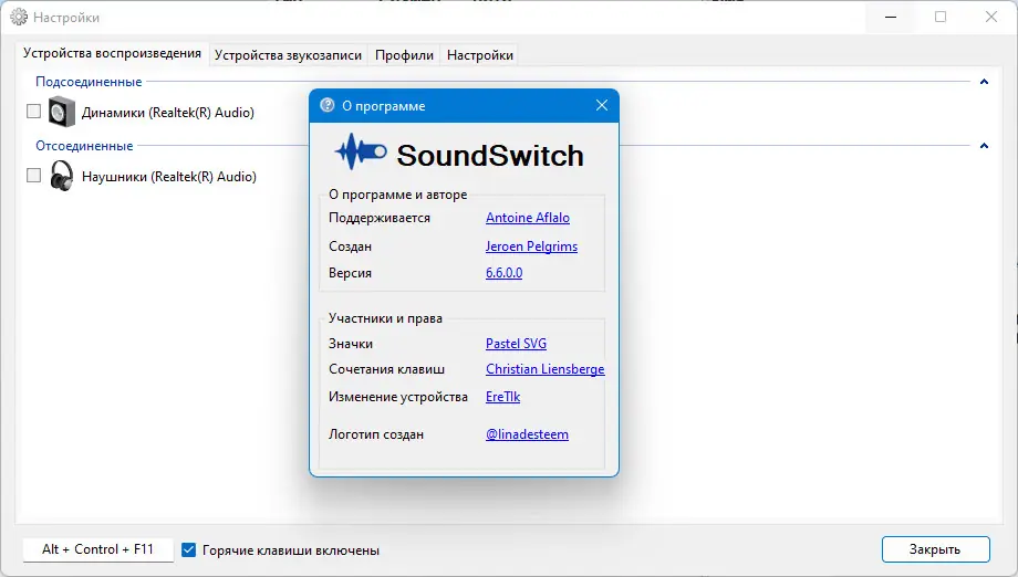- Быстрое переключение между звуковыми устройствами с помощью горячих клавиш