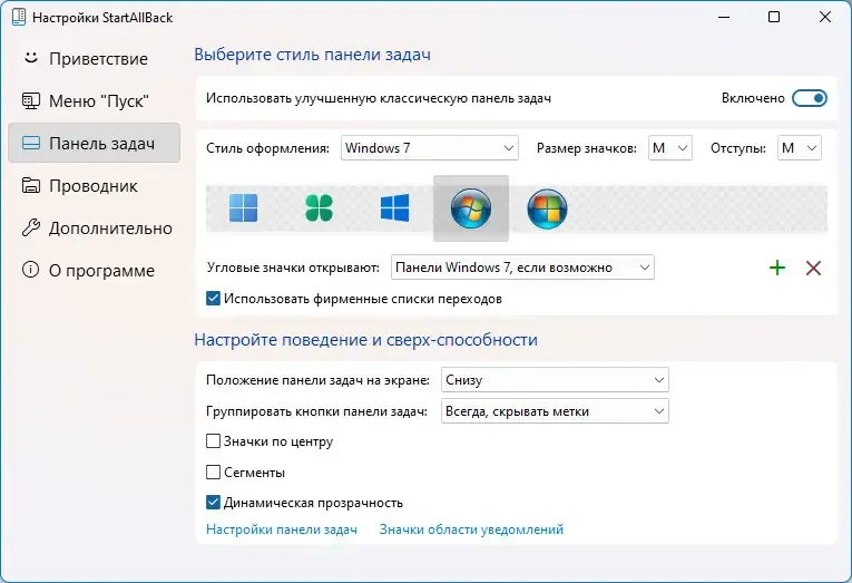 Для начала работы с программой достаточно скачать и установить StartAllBack на компьютер. После установки программа автоматически интегрируется в систему и предлагает настройки интерфейса через удобный интерфейс. В настройках можно выбрать внешний вид меню Пуск, изменить изображение кнопки, активировать или отключить активные углы экрана и настроить отображение значков. Для пользователей, желающих вернуть привычный стиль Windows 7, доступны предустановленные шаблоны. Все изменения применяются мгновенно, без необходимости перезагружать компьютер. Также программа позволяет сохранять несколько профилей настроек для быстрого переключения между разными стилями.
