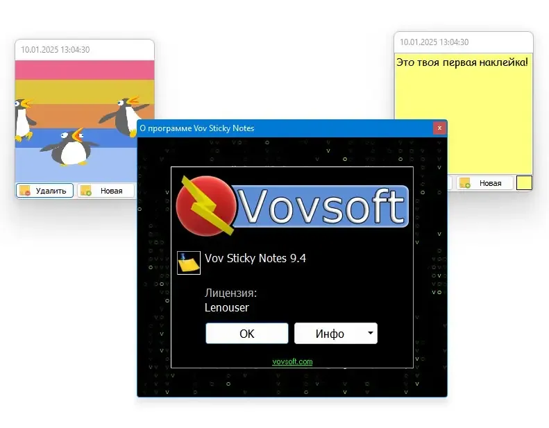Vov Sticky Notes — это удобное приложение для создания заметок на рабочем столе, которое помогает организовать важную информацию и повысить продуктивность. Программа позволяет легко добавлять текстовые заметки, изображения и напоминания, делая рабочий процесс более структурированным и комфортным. Благодаря простому интерфейсу и множеству функций, она идеально подходит как для личного использования, так и для работы в офисе или учебе.