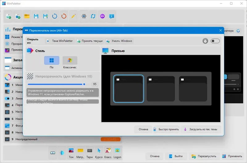 WinPaletter — это портативное приложение для настройки цветовой схемы Windows 10 и 11. Оно позволяет легко и быстро изменять цвета панели задач, стартового меню, экрана блокировки и входа в систему без необходимости сложных настроек. Программа обладает интуитивным интерфейсом и широкими возможностями для персонализации, что делает её популярным выбором среди пользователей, желающих создать уникальную тему оформления системы.