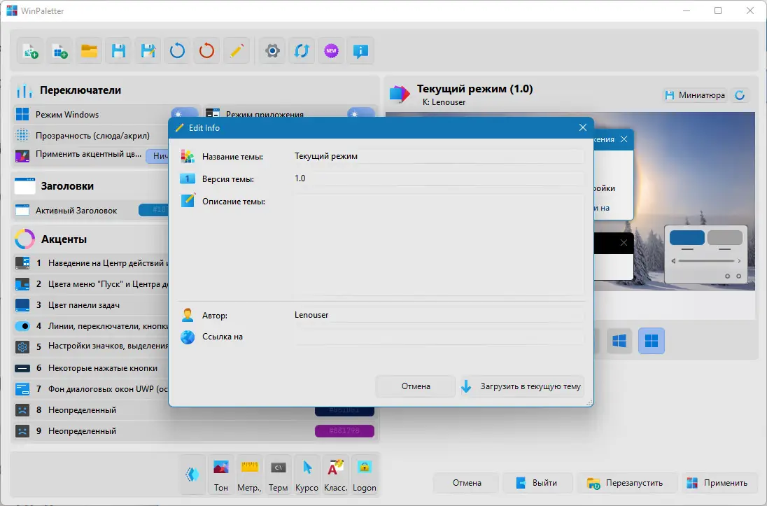 WinPaletter — это современный инструмент, который предоставляет расширенные возможности по настройке внешнего вида Windows. Он позволяет изменять цветовую палитру системы, настраивать стиль панели задач, стартового меню и программ. В отличие от стандартных средств, программа предлагает более гибкие параметры и не требует ручного ввода RGB-значений, что делает процесс персонализации проще и быстрее. Также WinPaletter заботится о сохранении настроек, позволяя создавать и сохранять различные темы для быстрого переключения. Это решение подойдет тем, кто хочет изменить внешний вид системы без риска вирусных заражений или сложных манипуляций с системными файлами. Возможность скачать программу на русском языке делает ее доступной для широкой аудитории.