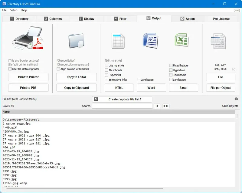 Directory List & Print — это удобный менеджер каталогов, который позволяет просматривать, печатать и экспортировать список файлов и папок. Программа облегчает работу с файловой структурой на жестком диске, предоставляя расширенные возможности фильтрации и форматирования. Благодаря ей можно быстро получить подробную информацию о содержимом дисков и сохранять её в различных форматах для дальнейшего использования.
