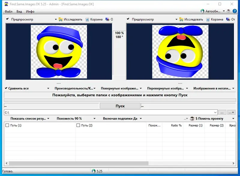 Для начала работы с программой необходимо запустить её и выбрать папки, в которых расположены изображения. После этого достаточно запустить процедуру сравнения, и программа начнет анализировать файлы, генерируя графические подписи и сравнивая их по пикселям. В процессе сравнения программа автоматически обнаружит одинаковые, похожие, зеркальные или повернутые изображения, даже если они были отредактированы или изменены по размеру. Для удобства есть предпросмотр, который позволяет быстро оценить результаты поиска. В итоге пользователь получает список схожих файлов, что облегчает их удаление или организацию.