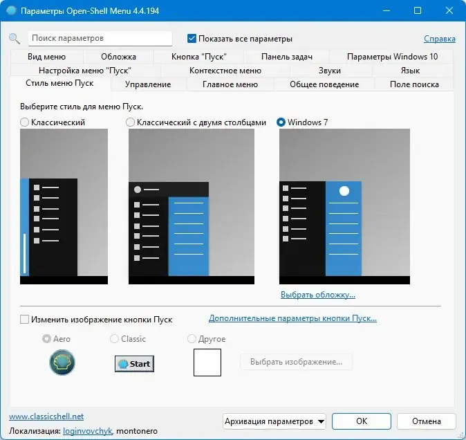 - Поддержка различных стилей оформления меню «Пуск», включая классический и стиль Windows 7.