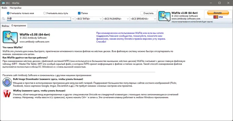 WizFile — это программа, которая обеспечивает мгновенный поиск файлов и папок на жестком диске без необходимости создавать отдельную базу данных. Она отлично подходит для системных администраторов, пользователей, желающих навести порядок на диске, и тех, кто ищет быстрый способ определить крупные файлы и папки. Программа обладает высокой скоростью индексации и поиска благодаря использованию оперативной памяти, что делает её одной из самых быстрых в своём классе. Кроме того, WizFile позволяет составлять сложные поисковые запросы с использованием метасимволов и фильтров по типам файлов, что значительно расширяет возможности поиска.