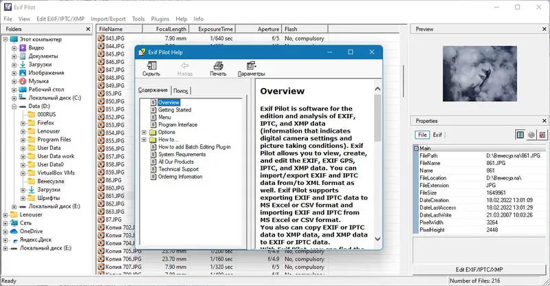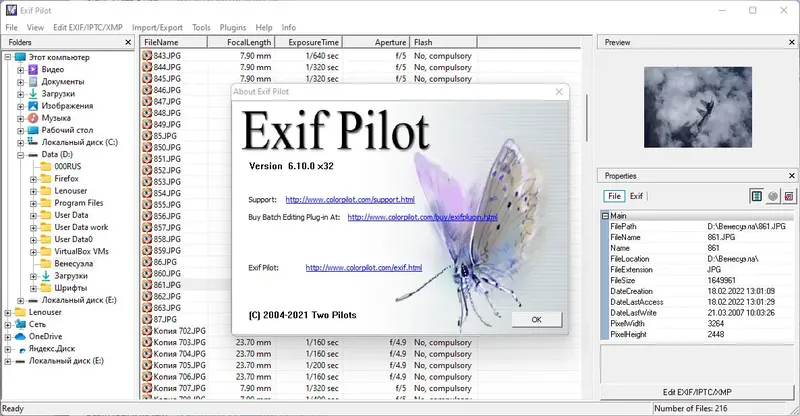 Exif Pilot — мощный редактор метаданных для фотографий, который позволяет просматривать, редактировать и создавать EXIF, IPTC, XMP и GPS данные в различных форматах изображений. Программа поддерживает работу с популярными форматами, такими как JPEG, TIFF, PNG, DNG, а также с RAW-фотографиями, включая CR2, NEF, PEF и другие. Благодаря интуитивно понятному интерфейсу и широкому набору функций, Exif Pilot является незаменимым инструментом для профессиональных фотографов и любителей, желающих управлять метаданными своих снимков и повышать качество обработки изображений. Скачать pro-версию или portable-установку можно на официальной странице программы.