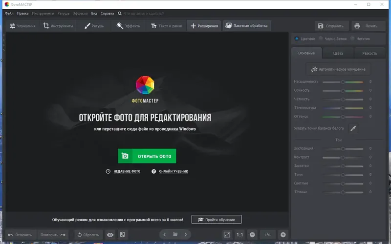 ФотоМАСТЕР — это универсальный редактор изображений, созданный для быстрого преобразования фотографий и их профессиональной обработки. Программа отличается высокой скоростью работы и богатым функционалом, который включает изменение цвета, резкости, контраста, удаление нежелательных элементов и применение разнообразных эффектов. Благодаря своей простоте, она идеально подходит для тех, кто хочет улучшить фотографии ов без особых навыков ретуши и графического дизайна.