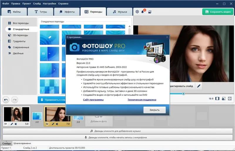 ФотоШОУ PRO — это мощный и доступный редактор для создания слайд-шоу с широкими возможностями настройки. Он отлично подходит как для начинающих, так и для профессионалов, которые хотят быстро реализовать свои идеи. Высокая производительность и огромное количество эффектов позволяют создавать действительно эффектные видеопрезентации.