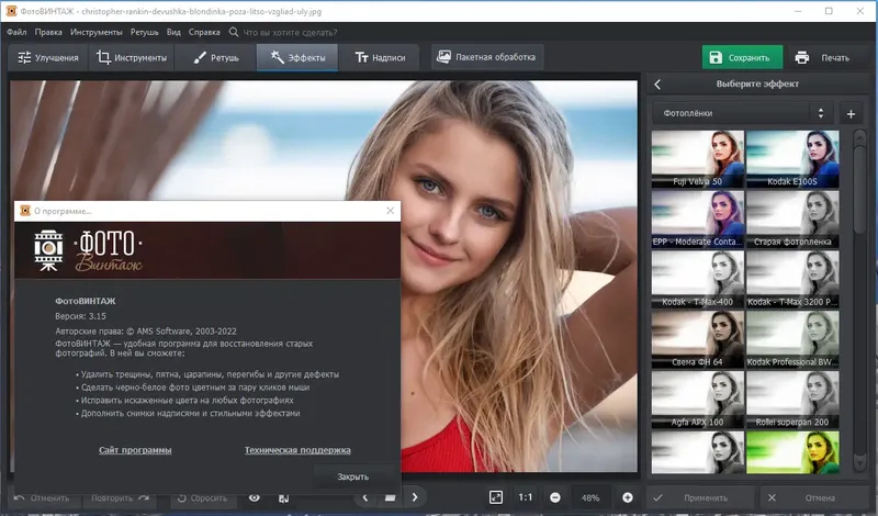 ФотоВИНТАЖ — это универсальный редактор, созданный для ретуширования фотографий, восстановления поврежденных изображений и их художественной обработки. Благодаря интуитивно понятному интерфейсу на русском языке, программа подойдет как новичкам, так и профессионалам. В арсенале есть инструменты для устранения царапин, пятен, разрывов и других дефектов, а также расширенные функции для раскрашивания черно-белых снимков и добавления эффектов.