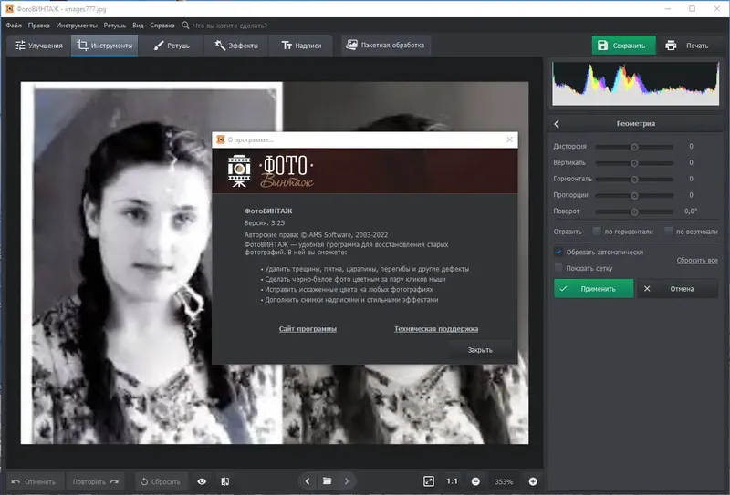 ФотоВИНТАЖ — это современный редактор изображений, специально созданный для восстановления и обработки старых фотографий. Он позволяет аккуратно удалять дефекты, делать снимки более четкими, выполнять цветокоррекцию и перекрашивать черно-белые фото в яркие цвета. Благодаря простому интерфейсу и мощным инструментам, программа подходит как для профессиональных ретушеров, так и для любителей, желающих сохранить семейные ценности в цифровом виде.