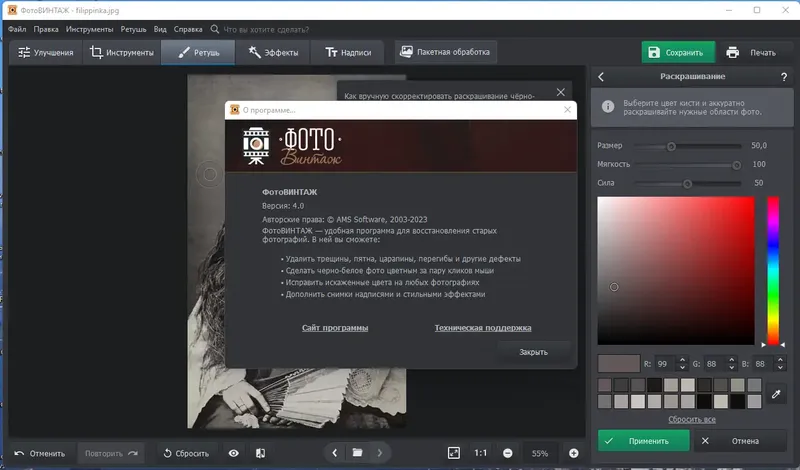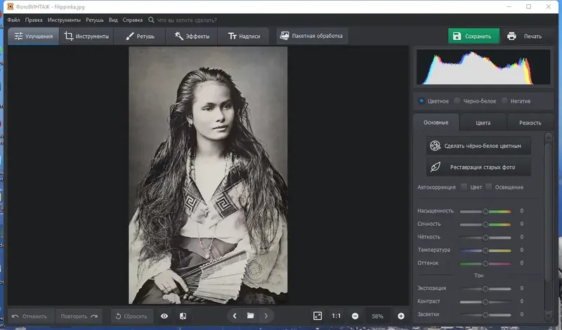 ФотоВИНТАЖ — это современный редактор для восстановления старых фотографий, который позволяет аккуратно устранить дефекты, сделать снимки более четкими и выполнить цветокоррекцию. Программа предназначена для работы с различными графическими форматами, включая JPG и RAW, и идеально подходит для ретуширования фотографий, реставрации и стилизации изображений. Благодаря интуитивно понятному интерфейсу и богатому функционалу она подойдет как новичкам, так и профессионалам, желающим вернуть старым снимкам их первоначальный вид.