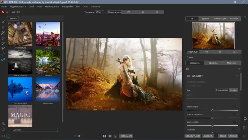 - Встроенные фотоэффекты и пресеты для креативного редактирования