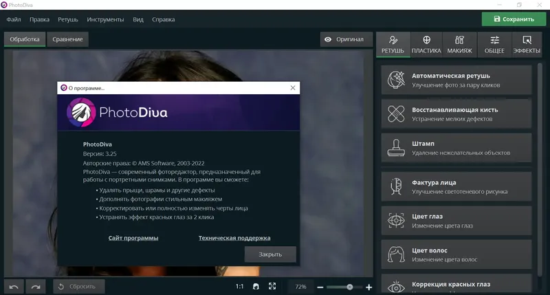 PhotoDiva — это современный фоторедактор, специально разработанный для ретуши портретных фотографий. Программа подходит как для начинающих пользователей, так и для профессионалов, желающих быстро и качественно улучшить снимки. Благодаря интуитивному интерфейсу и автоматическим функциям, она позволяет легко удалять дефекты кожи, менять фон, добавлять макияж и корректировать черты лица, создавая привлекательные портреты за считанные минуты. В числе преимуществ — широкий набор инструментов, богатая коллекция эффектов и возможность скачать программу для комфортной работы с фотографиями.
