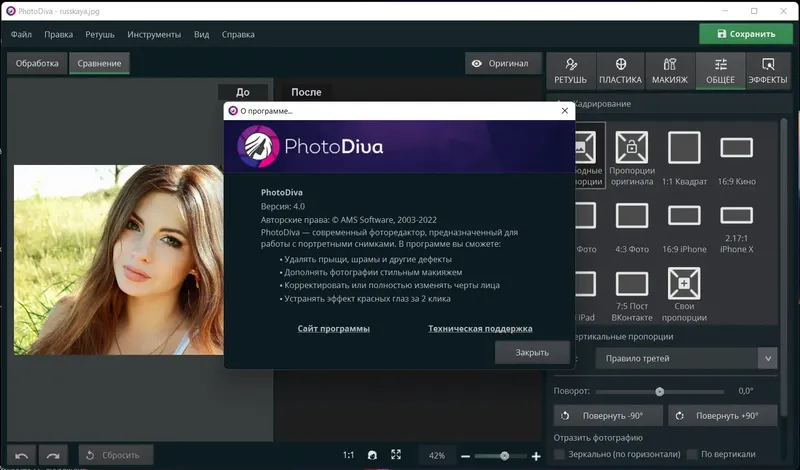 PhotoDiva — это мощный фоторедактор, предназначенный для профессиональной и любительской обработки портретных фотографий. Программа позволяет быстро и легко избавиться от дефектов кожи, изменить черты лица, добавить макияж и заменить фон, создавая идеальные снимки всего за несколько кликов. Благодаря автоматическим и ручным режимам работы PhotoDiva подойдет как новичкам, так и опытным фотографам, желающим повысить качество своих изображений без сложных настроек и долгого обучения.